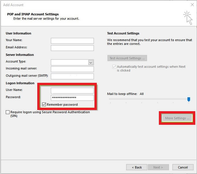 In Logon information: enter iCloud username and password - Check the box Remember Password and Require logon using secure password Authentication and then click on More Settings.